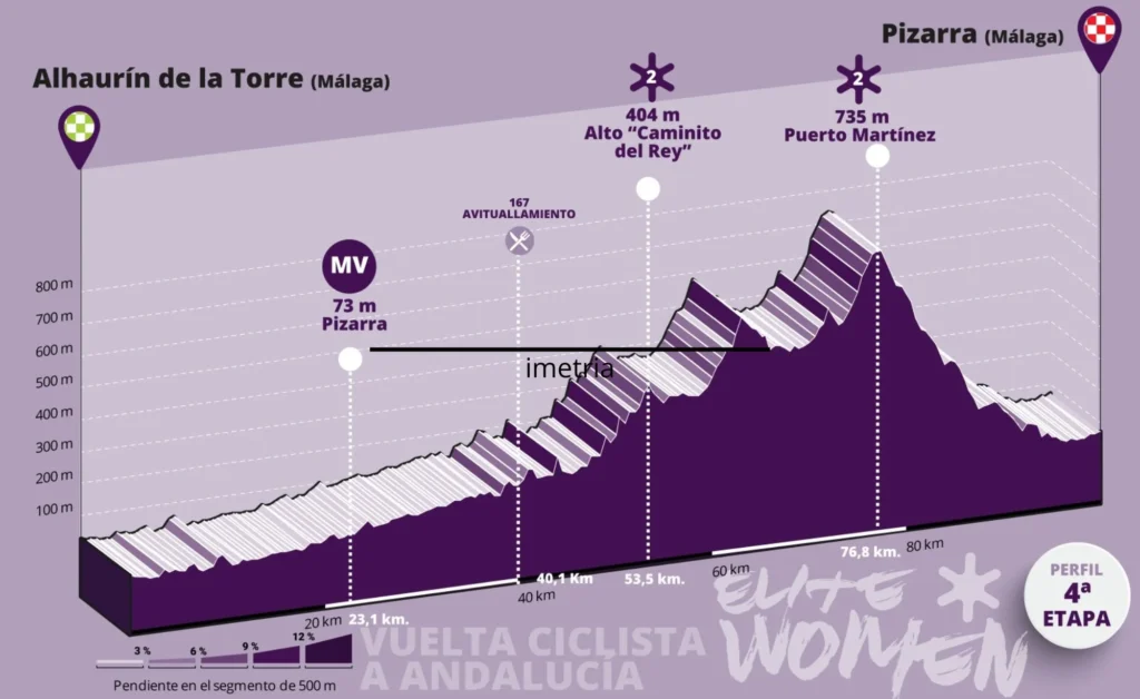 La cuarta etapa tendrá 100,2 kms donde unirá las localidades de Alhaurín de la Torre y Pizarra. Un inicio de carrera bastante rápido limitará las posibilidades de escapada hasta adentrarse en el municipio de Álora donde se prevé que a partir del municipio el control del pelotón se verá reducido dado al terreno quebrado y sinuoso que se presenta. El Alto del Caminito del Rey hará la primera selección del pelotón, terreno bastante quebrado hasta adentrarse en el Puerto Martínez que decidirá quién alzará los brazos en la última etapa de la Vuelta Andalucía Élite Women en Pizarra.